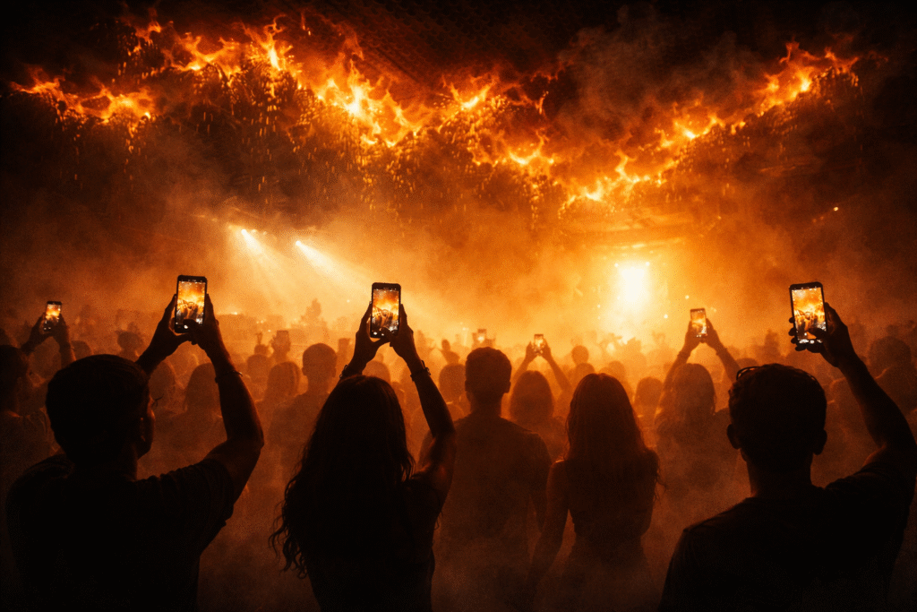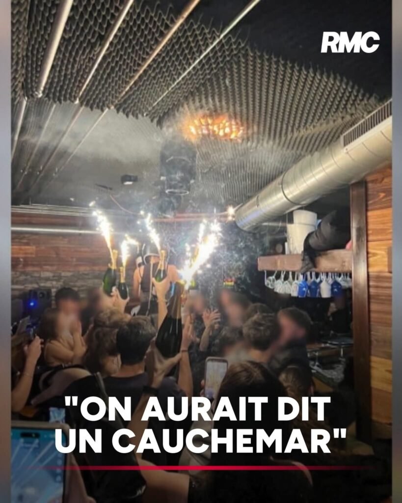 Les flammes lèchent le plafond, timides d’abord, presque jolies, comme un effet de scène de plus. Les basses frappent la poitrine, la lumière clignote, les corps bougent. Les téléphones se lèvent. On filme. On rit encore. On danse encore. La fête ne peut pas s’arrêter.