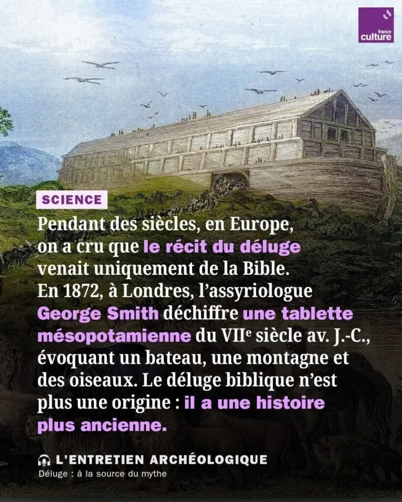 Cette image est extraite d’un post de France Culture accompagnant l’émission « Déluge : à la source du mythe ». Elle ne sert pas ici d’illustration décorative, mais de point de départ du débat. Elle condense visuellement une thèse largement répandue dans la culture contemporaine : pendant des siècles, l’Europe aurait naïvement cru que le récit du Déluge venait de la Bible, jusqu’à ce que l’archéologie moderne révèle son origine mésopotamienne plus ancienne.