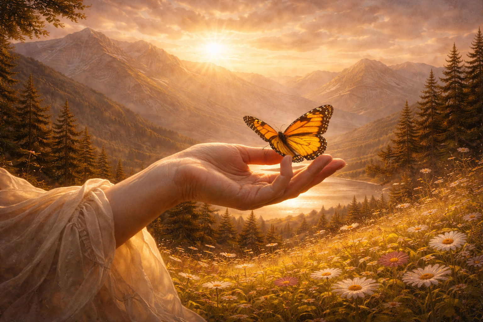 Le papillon posé sur la main sym­bo­lise ce qui ne se conquiert pas par la force. Liber­té, bon­heur et amour appa­raissent lorsque la main cesse de sai­sir et apprend sim­ple­ment à accueillir. La mon­tagne et le soleil cou­chant rap­pellent que ces dons appar­tiennent à l’ordre de la créa­tion : ils viennent à l’homme comme une grâce, lorsqu’il accepte d’ouvrir sa main plu­tôt que de la fer­mer.
