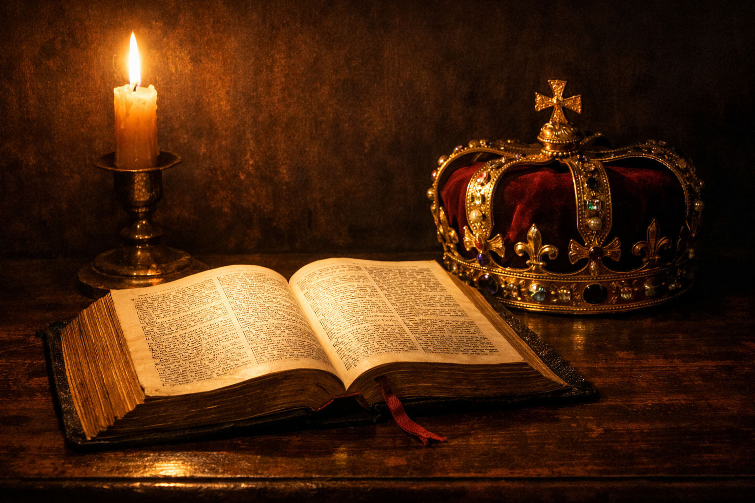 La lumière qui tombe sur la Bible rappelle que la véritable autorité dans la civilisation chrétienne ne vient pas d’abord du pouvoir politique mais de la révélation divine. La couronne, placée dans la pénombre, symbolise des pouvoirs humains parfois hésitants à affirmer la foi qui a pourtant façonné l’histoire de l’Occident.